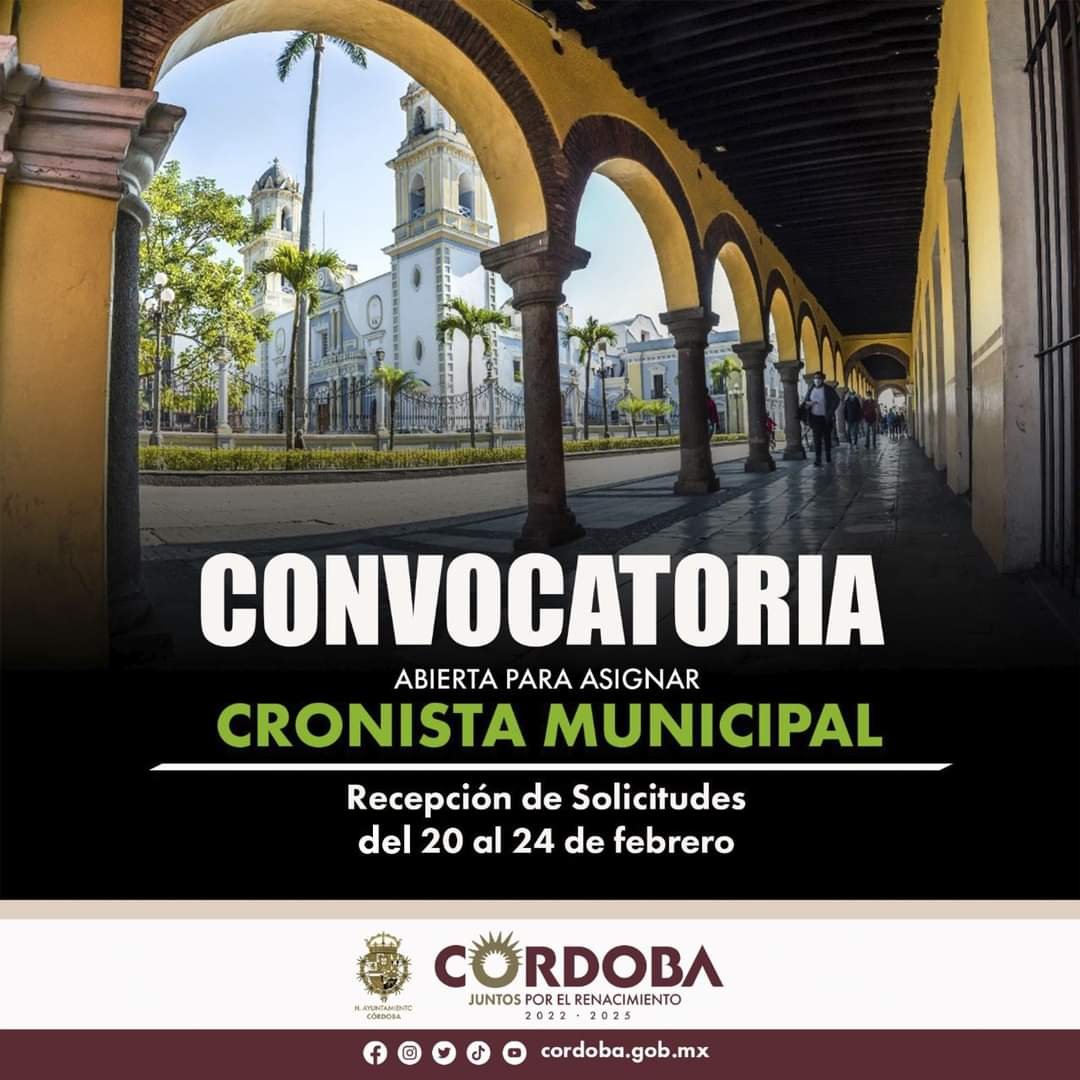 Córdoba, Ver., (19 de febrero de 2023). – El Ayuntamiento de Córdoba lanzó la convocatoria pública para las personas interesadas en ocupar el cargo de Cronista Municipal 2023-2025. A partir de este lunes 20 y hasta el 24 de febrero podrán presentar su solicitud en la Secretaría Municipal.