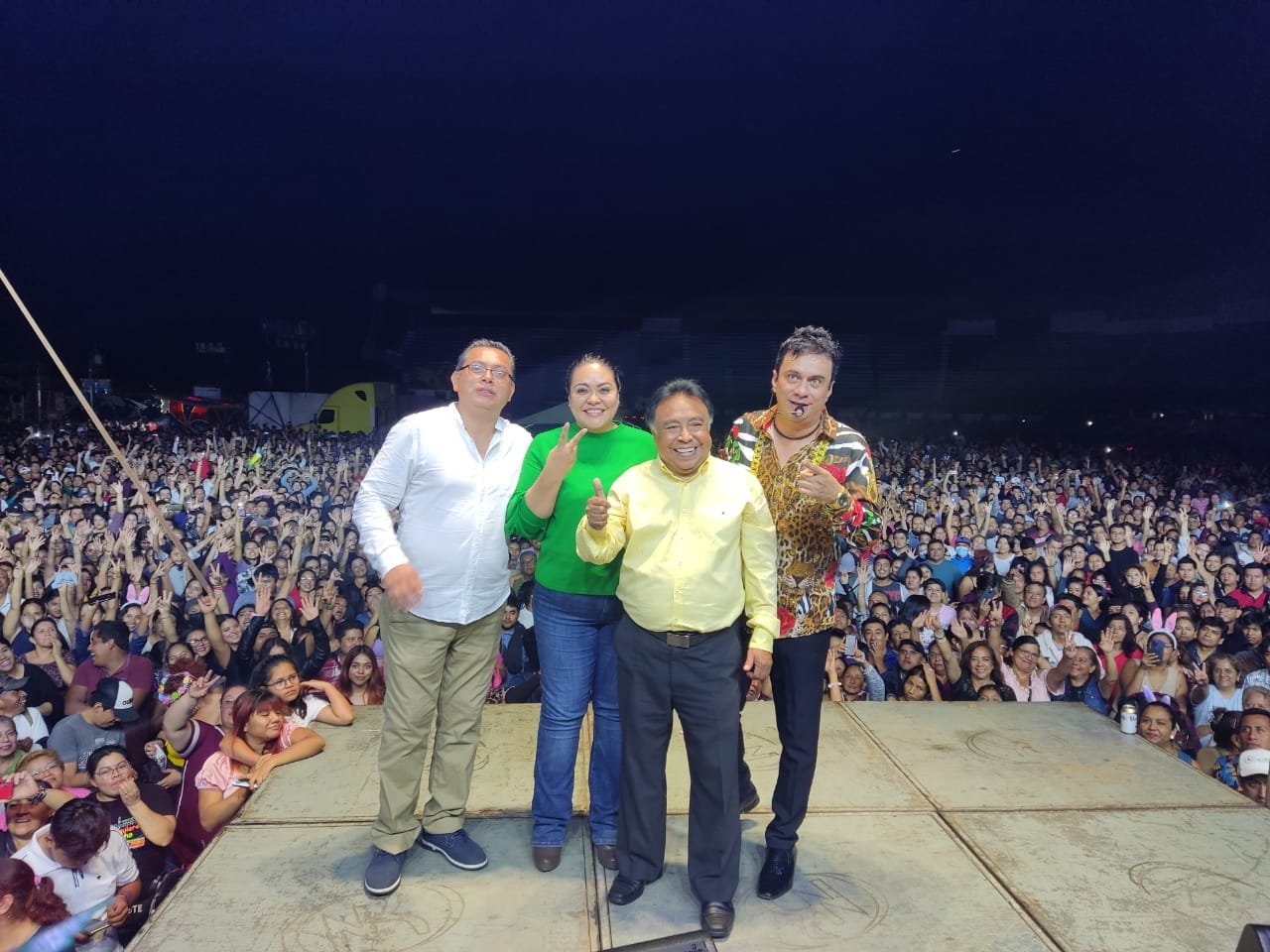 Acompañado de la síndica única, Vania López González, y del regidor primero Daniel Vázquez Hernández, la primera autoridad dio la bienvenida y se dijo agradecido por la presencia del rey del baile y que animó la noche y puso a bailar y corear a los cientos de asistentes en el estadio Beisborama.