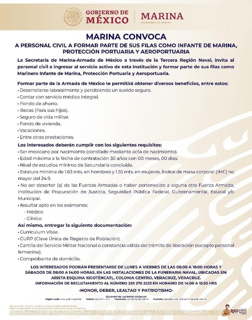 Los interesados también podrán presentarse de lunes a viernes de las 18:00 horas y sábados de 8:00 a 14:00 horas en las instalaciones de la funeraria Naval, ubicadas en Arista esquina Xicoténcatl, colonia Centro, Veracruz, Veracruz. Para información de reclutamiento al número 2292762223 de 14:00 a 15:30 horas.