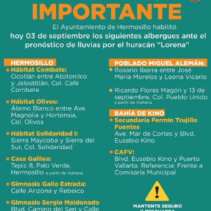 Asimismo, ante el pronóstico de más lluvias por el huracán ‘Lorena’ se habilitaron albergues en Hermosillo, el poblado Miguel Alemán y Bahía de Kino.