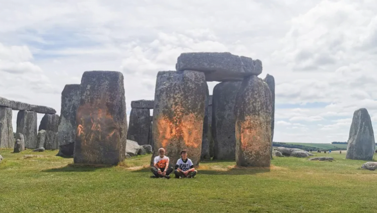 Dos activistas del grupo ecologista Just Stop Oil fueron detenidos después de rociar con pintura naranja el famoso monumento megalítico de Stonehenge en Wiltshire, en el suroeste de Inglaterra.