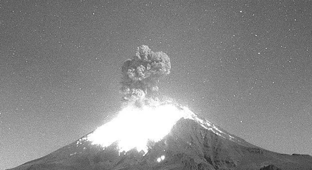 En una de las dos grandes explosiones del volcán Popocatépetl se generó una columna de ceniza con lanzamiento de material incandescente